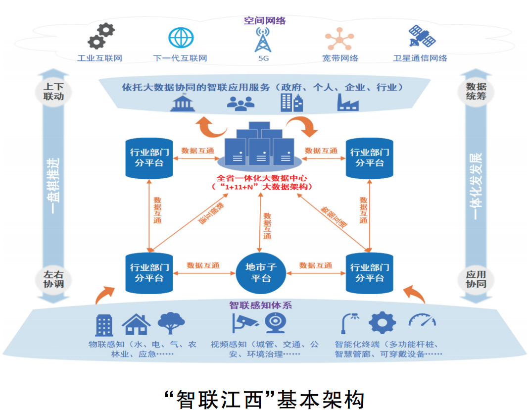 按照“三联一智”基本框架,坚持全省“一盘棋、一体化”、统分结合、联动协同推进“智联江西”建设。