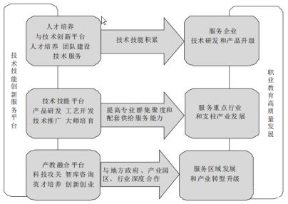 2.优势带动,功能精准。技术技能创新服务平台要瞄准产业转型升级需求,做到功能精准。人才培养与技术创新平台服务企业技术研发和产品升级,技术技能平台服务重点行业和支柱产业发展,产教融合平台服务区域发展和产业转型升级。通过创新资源优化配置,促进创新成果的孵化、转化和推广。