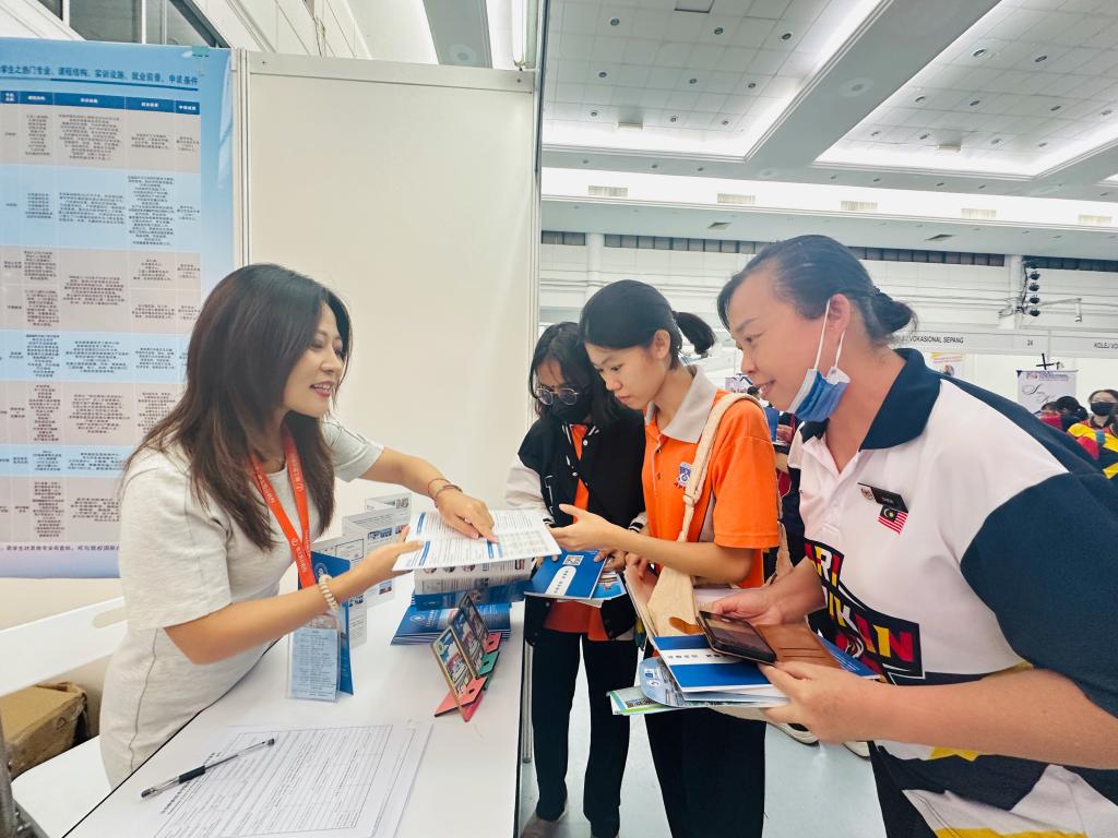 教育展上,刘家峻为马来西亚的家长和学生详细讲解学校的办学规模、专业优势以及招生政策,并分享了自己在学校的学习和生活体验。同时,还与现场咨询的家长和学生进行深入交流,耐心解答学校的留学政策、奖学金申请流程等问题,现场氛围热烈。