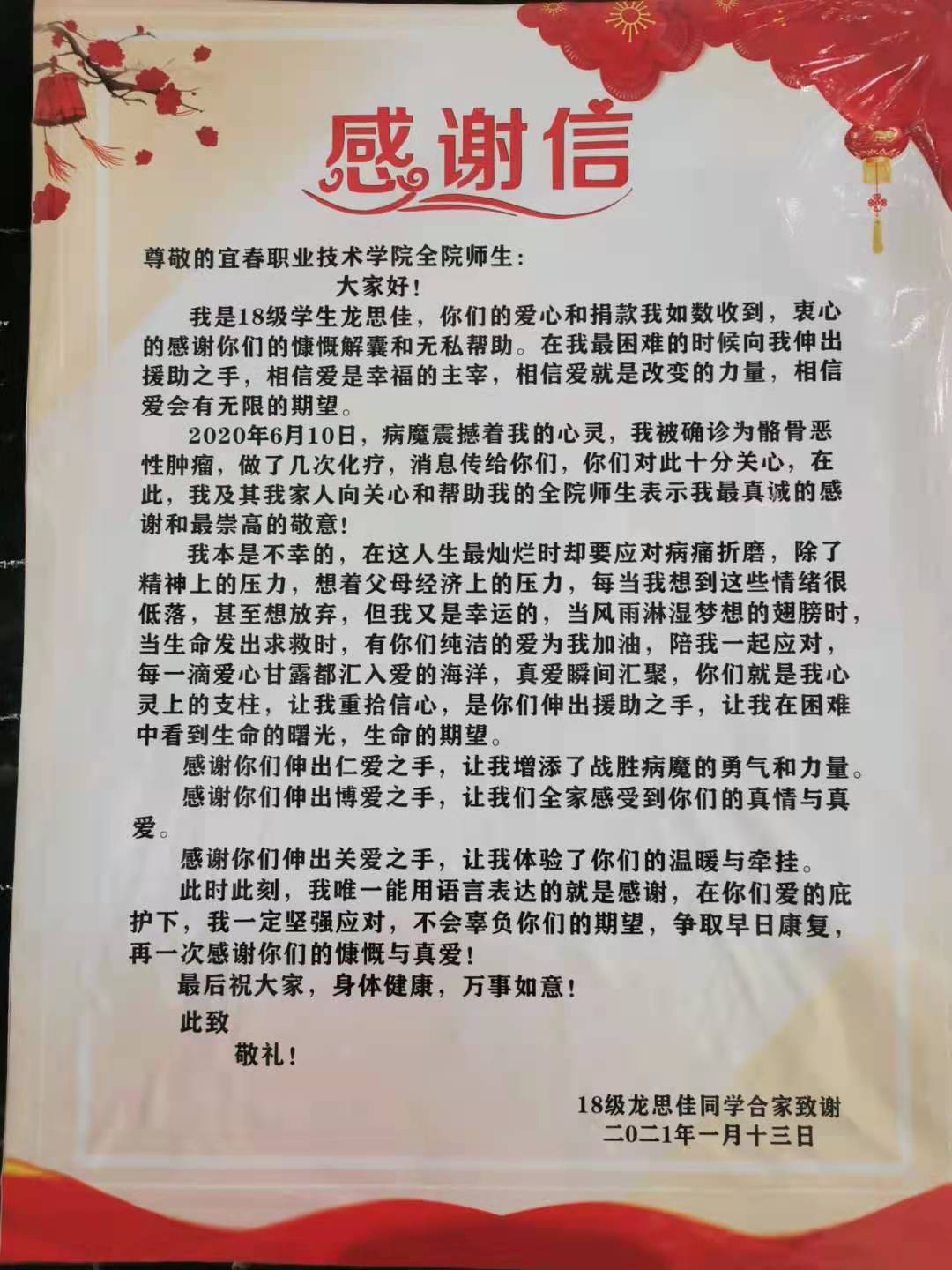 也许我们募集的善款对于她高额的医疗费用可能是杯水车薪,但这承载着全体宜职人的关爱,带去的是大家满满的祝福与希望。我们共同祝福龙思佳同学能够早日战胜病魔,恢复健康,回到宜职这个温暖大家庭的怀抱!