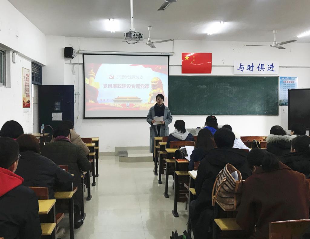 本站讯(护理学院 张晋晋)为深入开展“不忘初心、牢记使命”主题教育,进一步贯彻落实学校全面从严治党工作精神,12月24日下午,护理学院党总支组织全体党员在第四教学楼410教室开展了“党风廉政建设专题党课”活动,活动由党总支副书记胡蓉主持,院长周俊杰主讲。