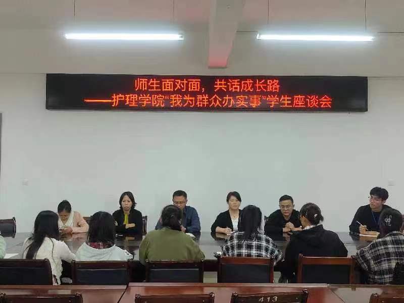 为深入学习贯彻习近平新时代中国特色社会主义思想,着力推进全员全程全方位育人,11月6日,护理学院在和济楼C218开展“我为群众办实事”师生座谈会,班子成员与各年级学生代表面对面交流。