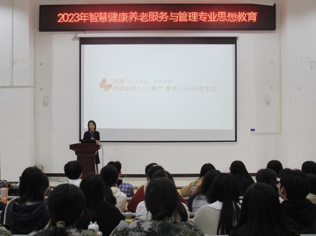 谭蓉详细介绍了以人为本、以服务为核心的泰康养老管理模式、“1+N”多学科照护团队医学、康复医学、健康管理三大医学中心,为居民构筑起紧急救助健康管理老年康复三重防线的泰康医院,帮助“泰康班”同学们了解企业文化和理念,对智慧健康养老服务与管理专业发展和就业有了更直观的认识。
