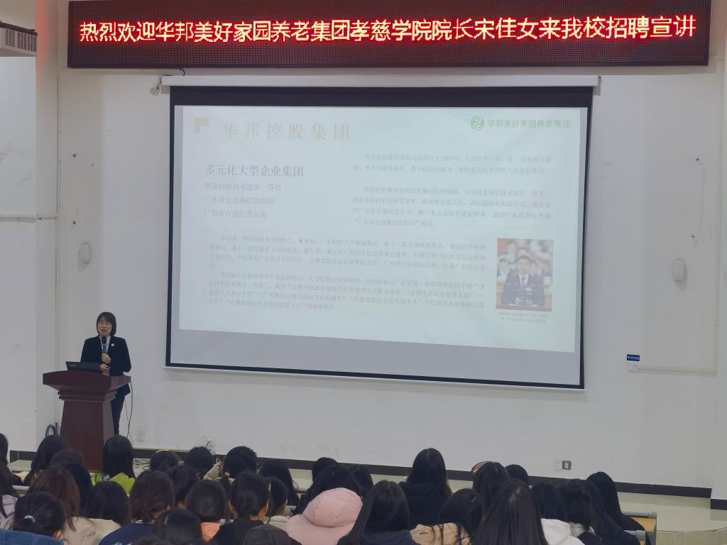 为贯彻落实党中央、国务院对高校毕业生就业工作的重要指示和部署,抢抓毕业生离校前就业关键期、冲刺期,进一步拓宽毕业生实习就业渠道,保证就业质量,扩大就业教育宣传实效,助力学生完成岗位实习和就业一体化工作,12月1日,护理学院邀请华邦美好家园养老集团孝慈学院院长宋佳女来校座谈指导并进行招聘宣讲活动。护理学院院长吴少林,智慧健康养老服务与管理专业教师杨红和汤薇出席座谈会,智慧健康养老服务与管理专业学生参加活动。