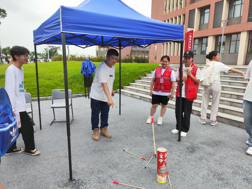本次活动特别增设了互动体验区,其中“知识问答赢五彩”和“投壶大比拼”两大活动专区备受青睐。“知识问答赢五彩”环节,同学们围绕端午历史、民俗典故展开激烈的智慧角逐。抢答声此起彼伏,现场气氛紧张而热烈。答对问题的同学喜获寓意平安的五彩绳材料包,既收获了知识,又得到了节日的祝福;而在“投壶大比拼”中,同学们手持箭矢,屏息凝神,全神贯注地瞄准目标,小心翼翼地投掷。每一次投掷都充满期待,投中者欢呼雀跃,现场洋溢着古今交融的欢乐氛围。大家在体验传统游戏乐趣的同时,也感受到了古代文化的独特魅力。