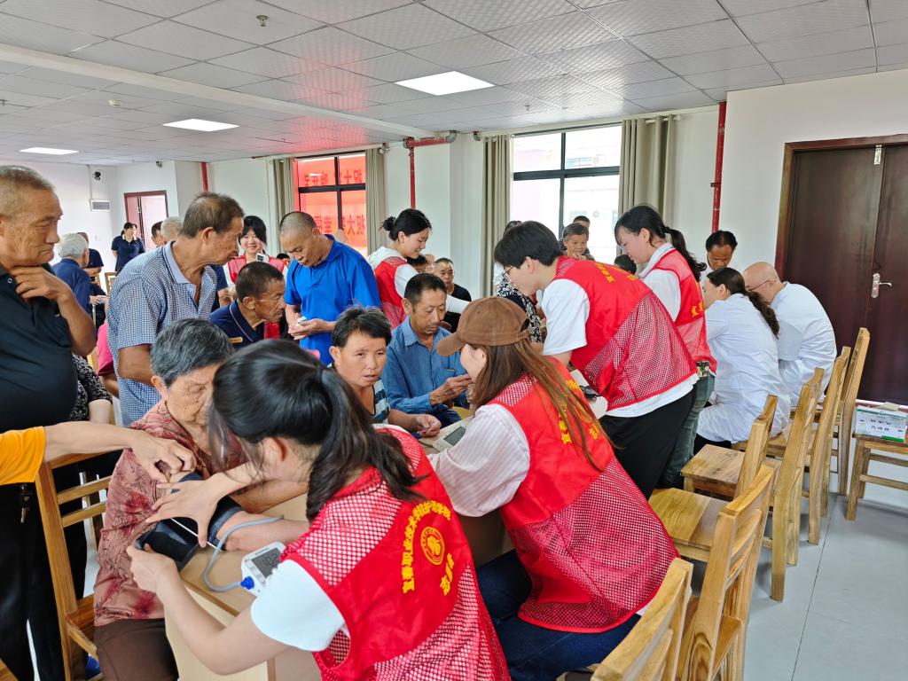 在万载县马步乡养老院,实践队的师生们与老年人亲切交谈,了解他们的生活起居和身体状况,为老年人健康体检,测量血压与血糖。同时,队员们细心陪伴老人,带领老人们练习手指操,帮助老人活动筋骨、增强体质。