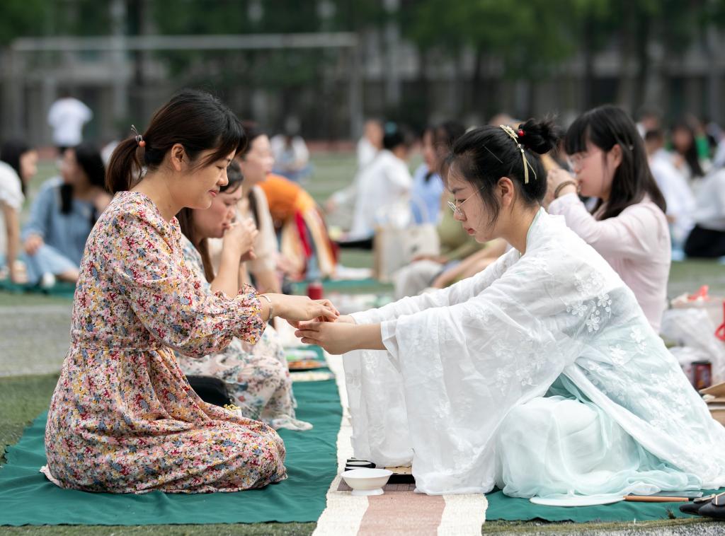 舞蹈《奔跑的青春》为茶会拉开了序幕。大家在一片宁静、美好的氛围中席地而坐,开始泡茶品茶;随后,校茶艺协会的学员们一一向大家展示了红茶、花茶、绿茶茶艺的冲泡程序,大家在优雅古典的名曲中品出了大自然的气息以及“人生百味”的感悟。在茶艺展示的过程中,同学们纷纷向自己的母亲敬奉一杯茶,大家在活动中更加懂得了知恩、感恩、报恩的道理。