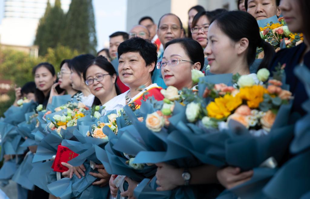 大会伊始,全场起立,奏唱国歌。党委副书记、校长杨云山宣读《关于表彰2021年“师德标兵”的决定》《关于表彰第七届优秀辅导员(班主任)的决定》《关于表彰教学名师、骨干教师、教坛新秀的决定》。在生动热烈、庄重而温馨的气氛中,校领导为3位“师德标兵”、2名教学名师、23位骨干教师、10名教坛新秀、10位优秀辅导员(班主任)、9名从教三十年教师及7位光荣退休职工颁发证书并献上鲜花。