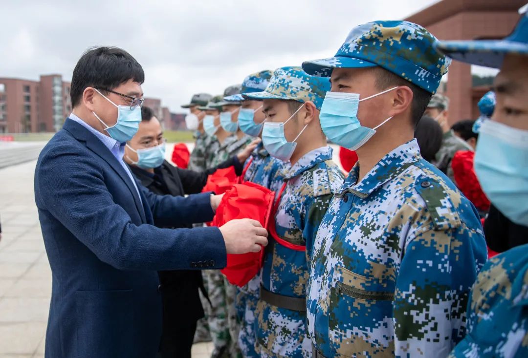 随后,参加仪式的领导、老师为全体新兵佩戴了大红花。新兵代表、医学院19级大药1班的邹新浩同学作了发言。