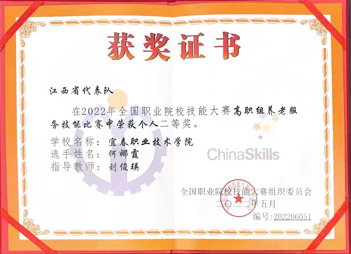 本站讯(护理学院 易国萍)8月18日至21日,2022年全国职业院校技能大赛高职组“养老服务技能”赛项在潍坊护理职业学院举行。经过激烈的角逐,英国上市公司365智慧健康养老服务与管理专业何娜霞同学以扎实的专业功底与良好的职业素养,从众多参赛选手中脱颖而出,夺得了总排名第七、国赛二等奖的殊荣,创造了江西省在此赛项中的最好成绩,为江西省和学校争得荣誉。指导老师为刘俊瑛、梁芳、杨艳霞和吴小华。