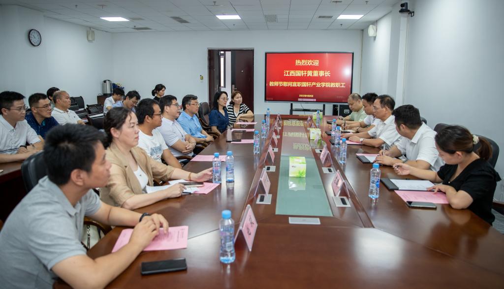 在座谈会上,任军对黄章喜一行的到来表示感谢,在教师节来临之前,黄章喜来产业学院看望师生,给他们送来了节日的祝福与前进动力。任军说:学校会鼓励学生积极加入产业学院,大力培养优秀学生,提升合作质量,在课程建设方面,建议开展数字教材,实行资源线上线下共享,同时定期召开工作会议,落实高水平专业建设,下半年会有越来越多的校企课程对接,期待与江西国轩有更多的合作。黄章喜代表江西国轩,对任军、邱军以及各位校领导一直以来的大力支持表示最衷心的感谢,并向全体教育工作者致以节日的问候和崇高的敬意,感谢他们始终坚持在教育工作岗位一线,为教育事业辛勤耕耘、默默奉献。在此过程中胡杰表示要扎实开展本职工作,积极营造学院的科研氛围,努力为学校的发展做贡献。
