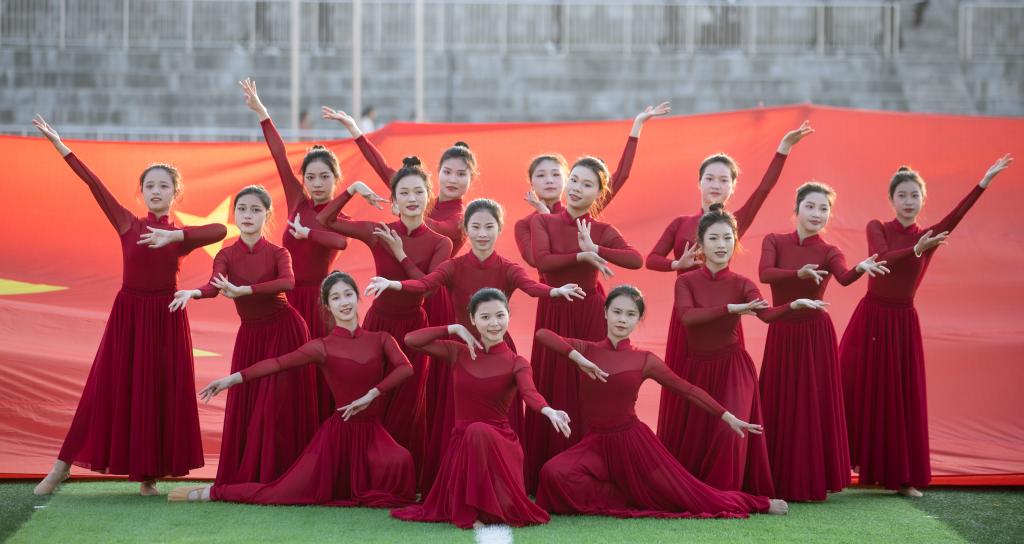 初冬的体育场,全体师生英姿勃发,群情激昂。8时28分,开场舞《万疆》以鲜艳的中国红点燃全场。场地中央,巨幅五星国旗铺展开来,缀有红星的花折伞美丽绽放,向心聚拢,如中华儿女与祖国母亲相依相偎,以凌云壮志,守国之万疆。