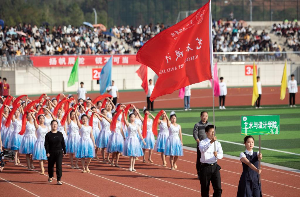 紧随其后的是各学院代表队。护理学院代表队手持红黄两色绸扇翩翩起舞,白衣天使展翼赛场;医学院代表队由身着戎装的退伍军人担当旗手,威武军礼,尽展蓬勃风貌;师范学院代表队手捧鲜花自信走来,如园丁呵护祖国的花朵,“四有好老师”的风范尽显其中;艺术与设计学院代表队着一袭白纱于红绸中飞舞,如同晚霞下的天鹅,轻盈曼妙……各院代表队相继登场,绸扇、翻花、彩带、无人机……造型多样,各具特色。他们脚步坚定,口号铿锵,势以奋斗之姿在本次运动会中彰显青春之貌。