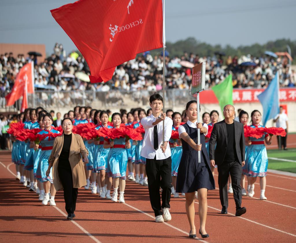 伴随着激昂的运动员进行曲,校国旗队、国旗护卫队踏着坚实有力的步伐率先入场。校旗、会徽、标语队、鲜花队、彩旗队、社团会旗队、裁判员代表队以及荣获江西省第十六届运动会十一人制足球专科甲组男子冠军的足球代表队依次入场,为田径场增添一抹抹亮色。