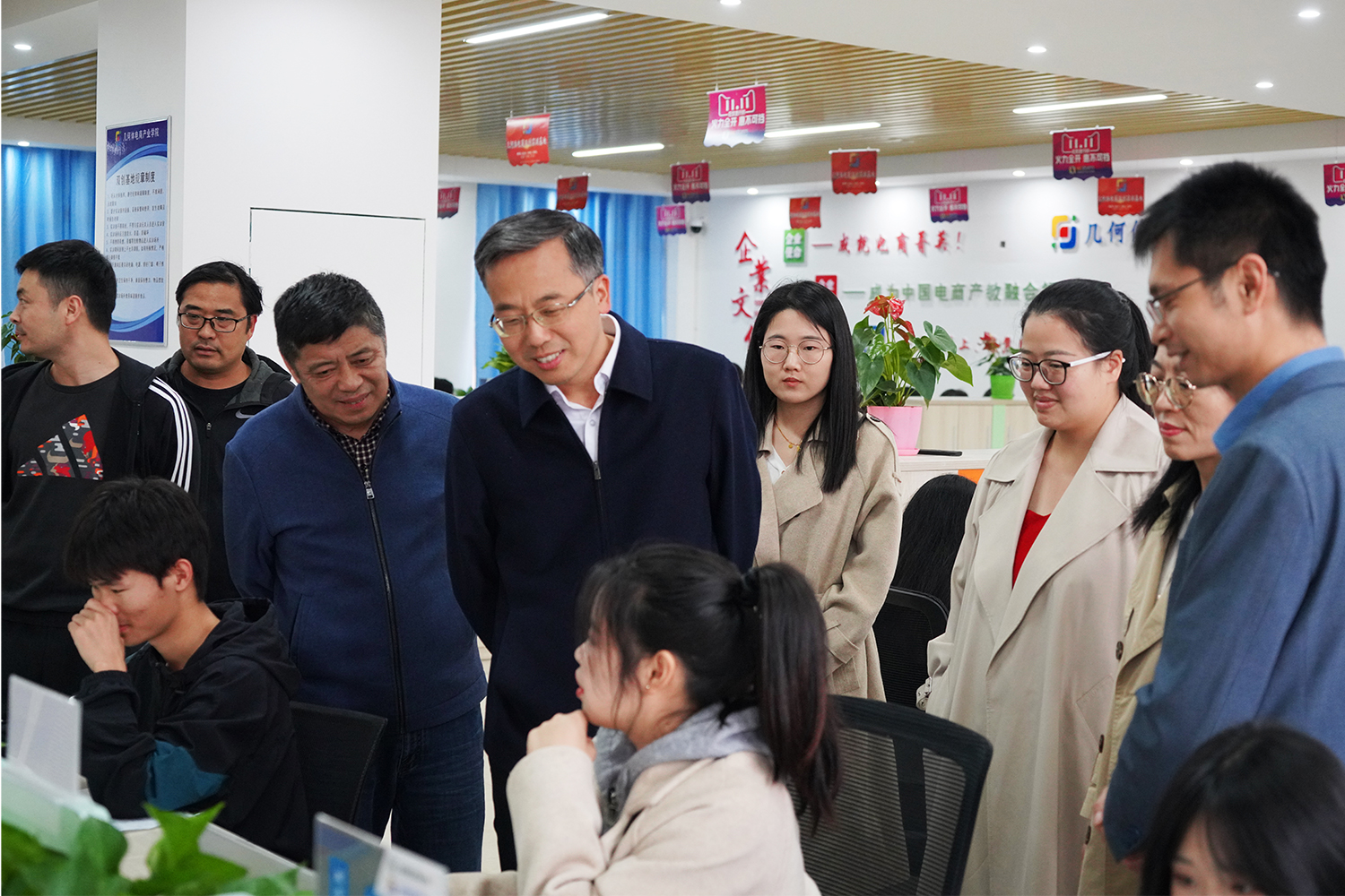 本站讯(经济管理学院 欧阳晓波 文玉泽)为进一步深化产教融合,推进校企协同育人,提高教学质量及人才培养水平,11月14日下午,党委副书记、校长邱军,党委委员、副校长易滨秀等一行到经济管理学院调研电商专业校企实训项目,经济管理学院领导班子及几何体电商产业学院负责人陪同。