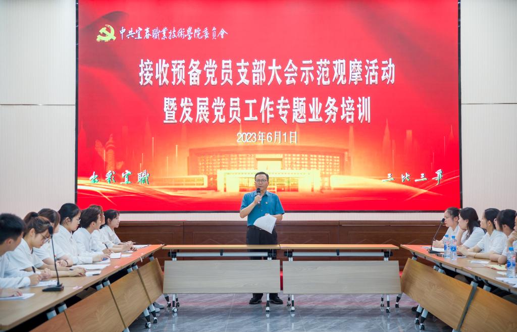 本站讯(组织部 严坤 张成永)为持续巩固党建“三化”建设结果,落实学校巡察整改方案以及2023年党建工作要点要求,规范“三会一课”制度,提升组织生活质量,6月1日下午,党委组织部联合师范学院党总支在天工楼四楼报告厅举行接收预备党员支部大会示范观摩活动暨发展党员工作专题业务培训。党委副书记黄继斌,党委委员、组织部部长韩海荣,组织部严坤,师范学院党总支书记邹晓英、院长肖勇,以及学校各基层党组织书记、组织委员等参加本次活动,宜春日报社魏华、黄永东两位同志列席本次活动。