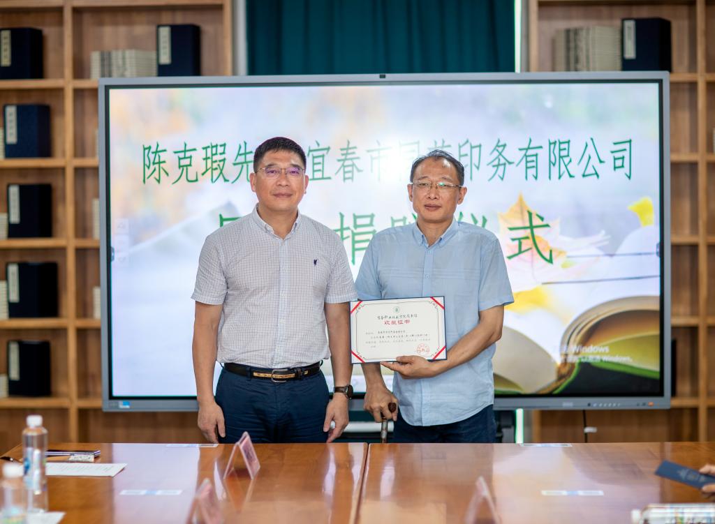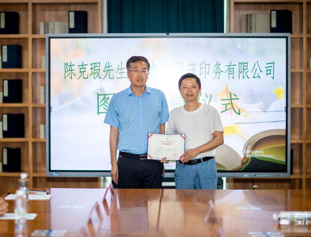 最后,任军、邱军分别向陈克瑕先生和同茂印务公司颁发了捐赠证书。