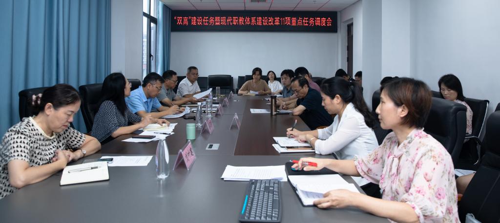 会议分两个阶段进行。第一阶段为进展通报。发展规划处处长杨莉通报了当前“双高”建设工作进展情况、存在问题和下一步工作打算,以及“现代职业教育体系建设改革11项重点任务”建设进展情况。