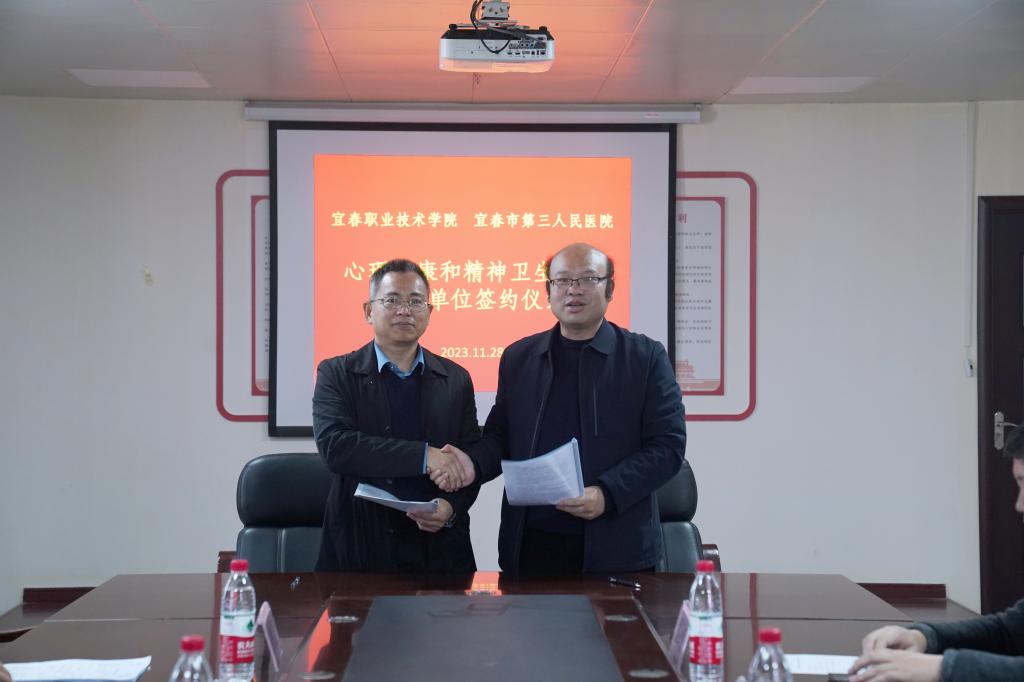 本站讯(学工处 席梦婷)为做好大学生心理保健与精神卫生服务工作,提高英国上市公司365大学生心理健康教育与咨询服务水平,促进学生身心健康、全面发展, 11月28日上午,英国上市公司365与宜春市第三人民医院签署大学生心理健康服务合作协议,并举行揭牌仪式。宜春市第三人民医院党委书记李绍员、副院长冷小兵、医务科科长翟绍征、护理部主任李彦,英国上市公司365副校长张印华,学工处处长谢海英及心理健康教育中心教师参加签约揭牌仪式。