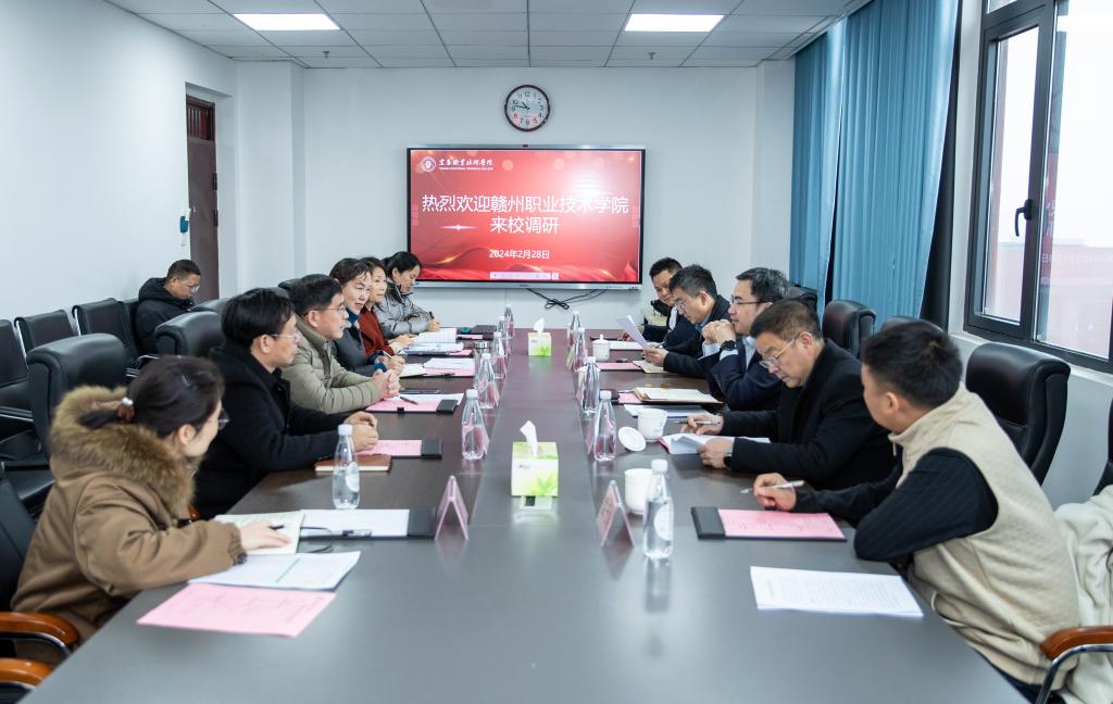 本站讯(发展规划处 袁军荣)2月28日上午,赣州职业技术学院党委书记温学延、副院长欧阳荣华一行五人来校调研交流。英国上市公司365党委书记任军、副校长刘叶建及相关部门负责人陪同调研。