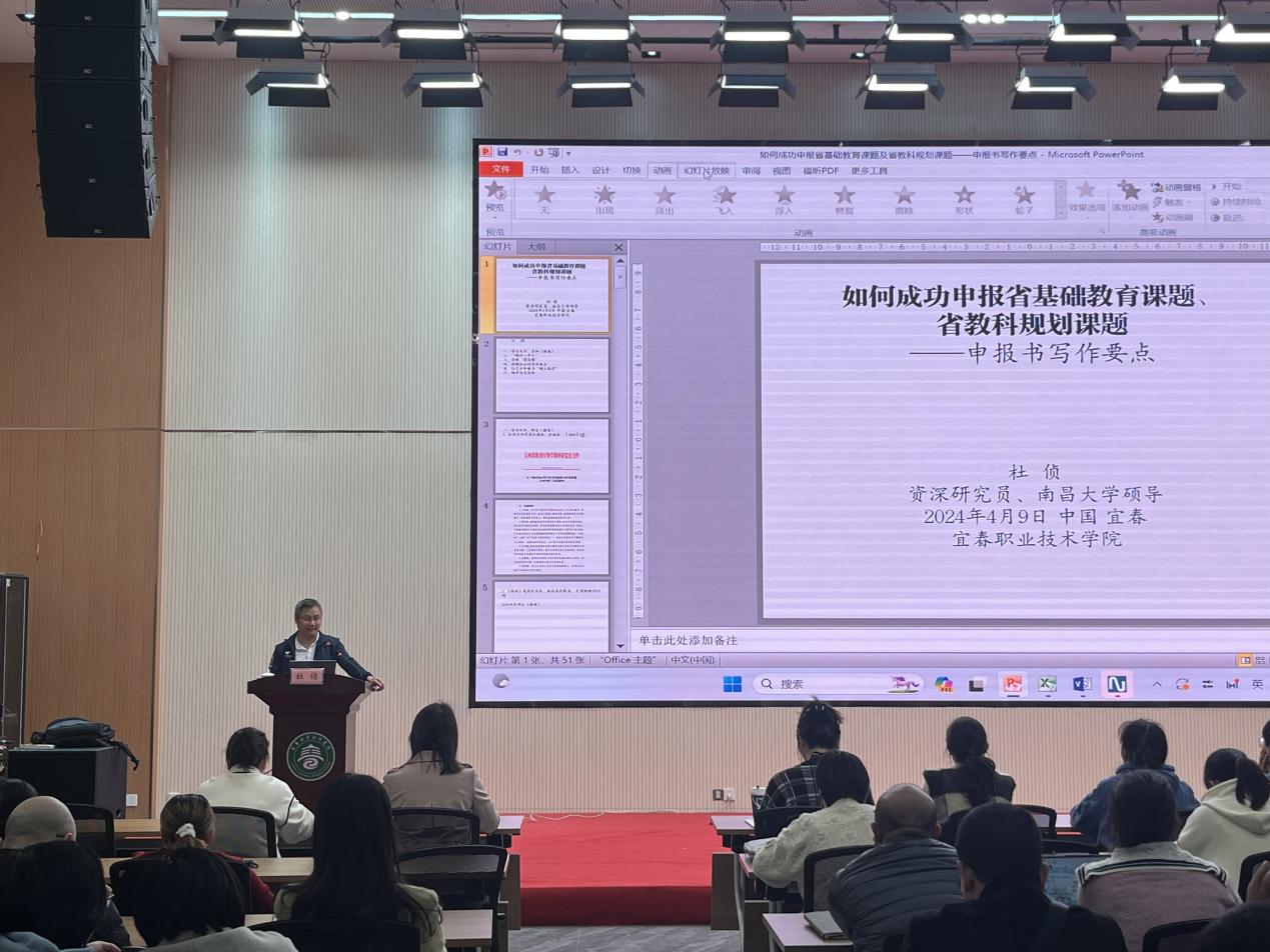 本站讯(科研处 冷欣)为服务全校教师申报省基础教育课题和省教科规划课题,强化课题申报意识,提高课题申请成功率,增强教师的科研能力,4月9日,科研处在天工楼学术报告厅举办“如何成功申报省基础教育课题及省教科规划课题——申报书的写作要点”专题讲座。讲座由资深研究员、南昌大学硕导杜侦主讲,由科研处处长敖美蓉主持,各二级学院、教学部共150余名教师参加讲座。