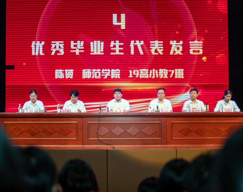 学生代表、师范学院19高小教7班陈赟追忆三年大学时光,感恩学校栽培、师长教诲,愿所有同学砥砺前行,以青春之名,赴时代之约。家长代表况永安感谢学校提供的优良环境与教育资源,感谢老师的付出奉献,感谢孩子用优异的成绩彰显了新时代青年的意气风发,愿孩子们继续保持奋斗的激情,在未来的道路上越走越广,越飞越高。