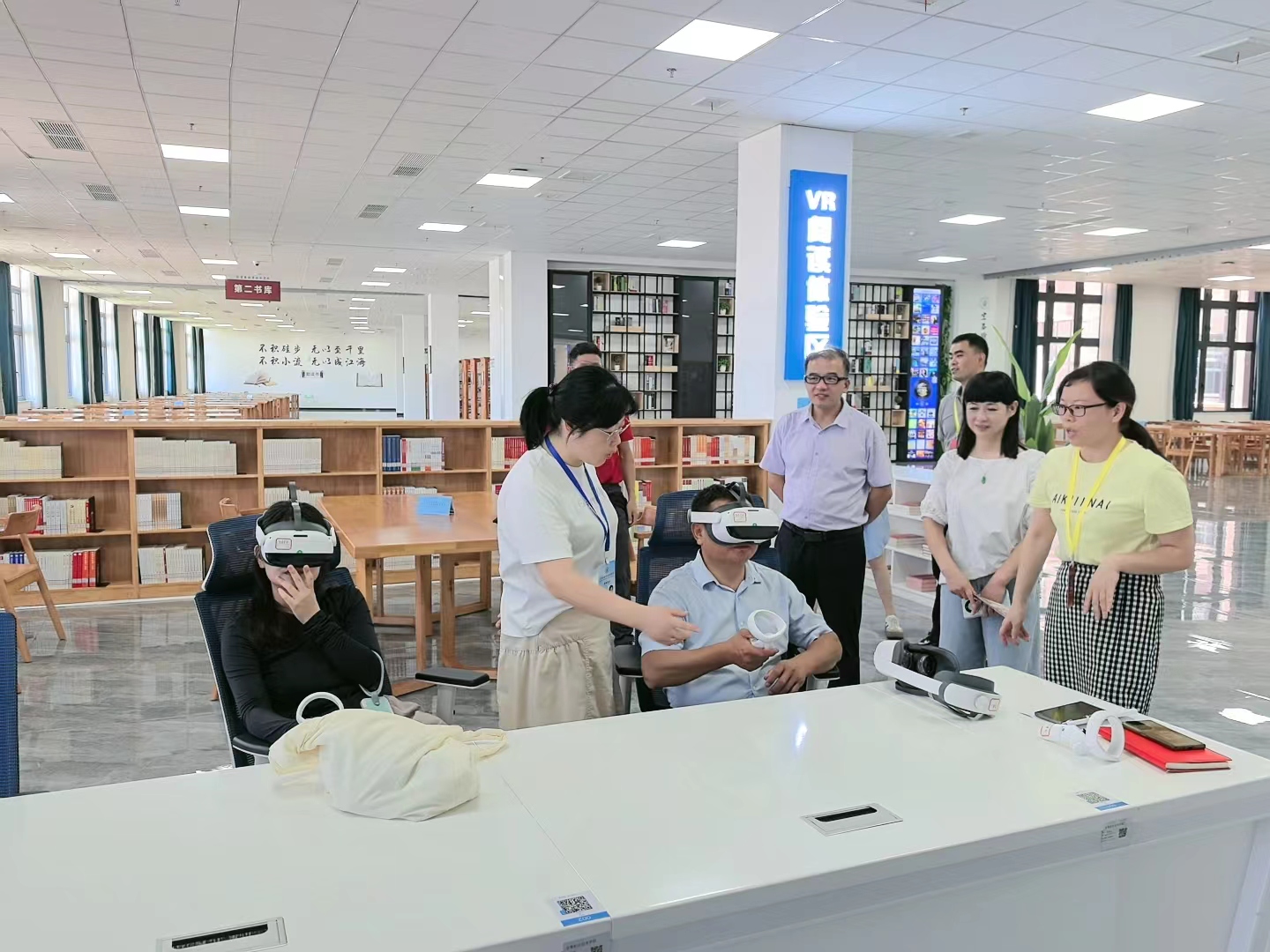 大家参观了图书馆的有声书屋、多功能厅、学生阅览室、教室阅览室、少儿阅览室、VR体验区、墨水屏阅览室、四楼新书库等,体验了智能钢琴、VR头盔、图书瀑布流、音乐瀑布流等智能化设备。
