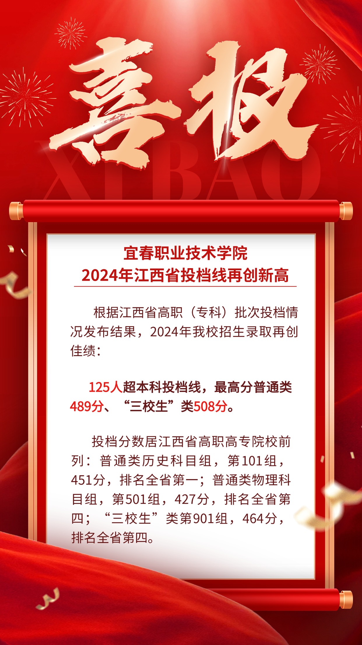 本站讯(党委宣传部 潘睿琦)2024年8月4日,江西省教育考试院公布2024年普通高校招生高职(专科)批次的投档情况。英国上市公司365投档线再创新高!其中,125人超本科投档线;历史类101组投档线为451分,位居全省第一;物理类501组、“三校生”类901组投档线分别为427分、464分,均居全省第四,全面展示了英国上市公司365在综合实力和教育质量上的全方位提升。