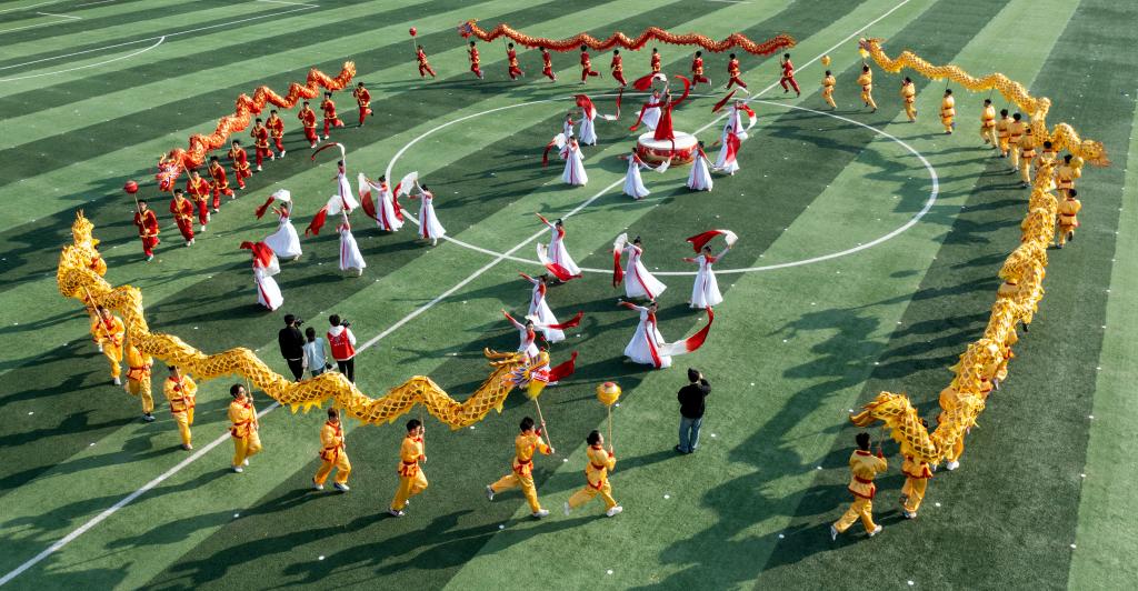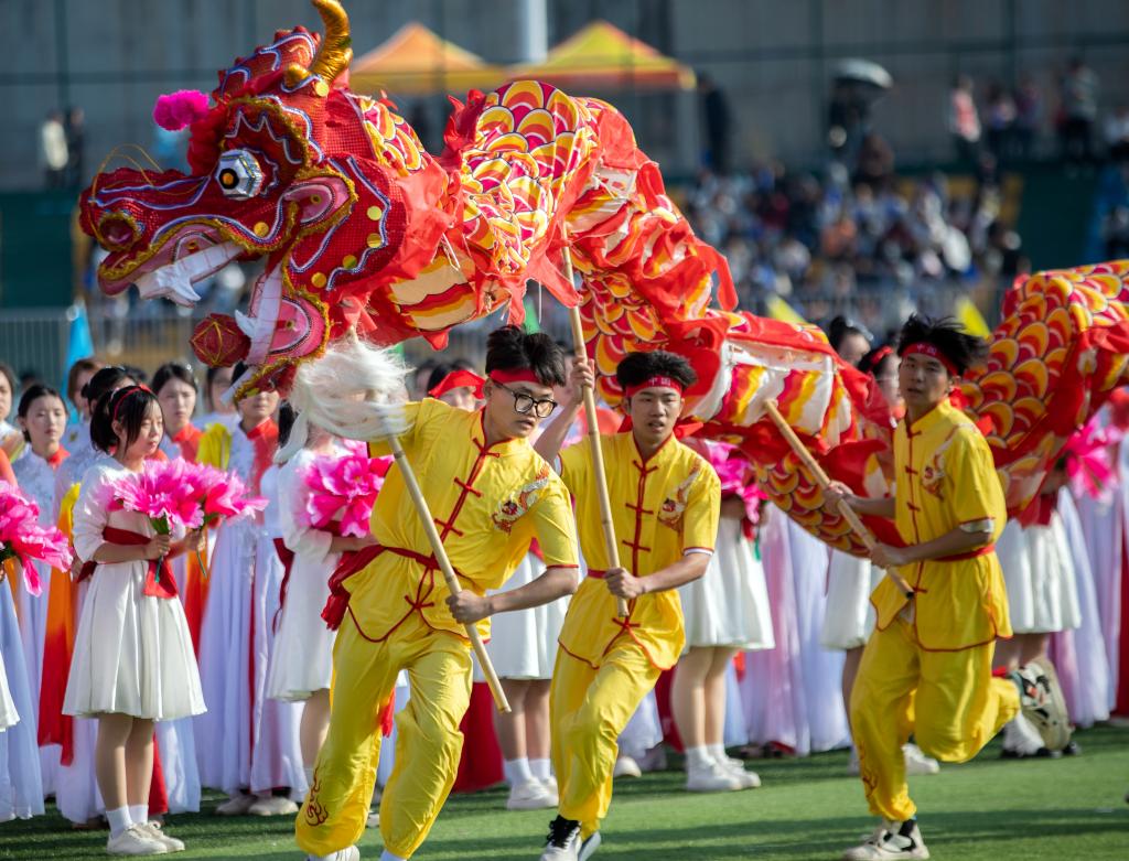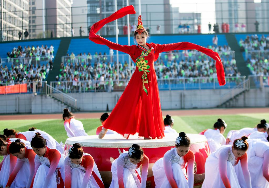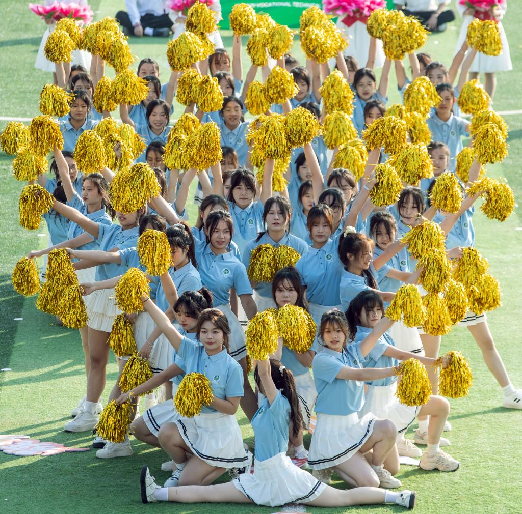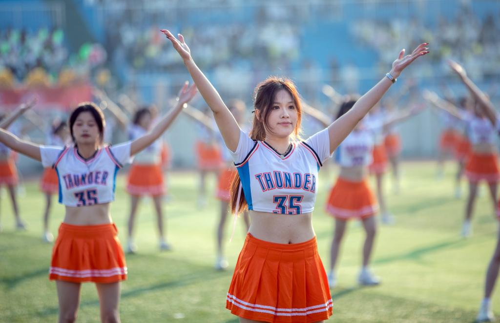 恰同学少年,风华正茂。护理学院带来的啦啦操《你要跳舞吗》,以动感的舞步点燃了绿茵场上的激情,亮银色的花球随着音乐的节律跳跃在缤纷的色彩中,青春的气息呼之欲出。医学院和军事体育部联合带来《天地龙鳞》健身气功八段锦,数百名学子身着中国风浓郁的武术服,一招一式,刚柔并济,尽显中华传统文化之魅力。机电与新能源汽车学院以军体拳《战舞飞扬》震撼全场,巨幅国旗拂过头顶,“立德成才,强国有我”的誓言响彻云霄。师范学院带来舞蹈《奔跑的青春》,舞步灵动,笑容飞扬。艺术与设计学院的《古典龙狮舞华章》将气氛推向高潮,在铿锵有力的鼓点中,巨龙翻腾,彩狮奔跃,红白水袖化作成灵动的彩扇,舞动千年文化魂。