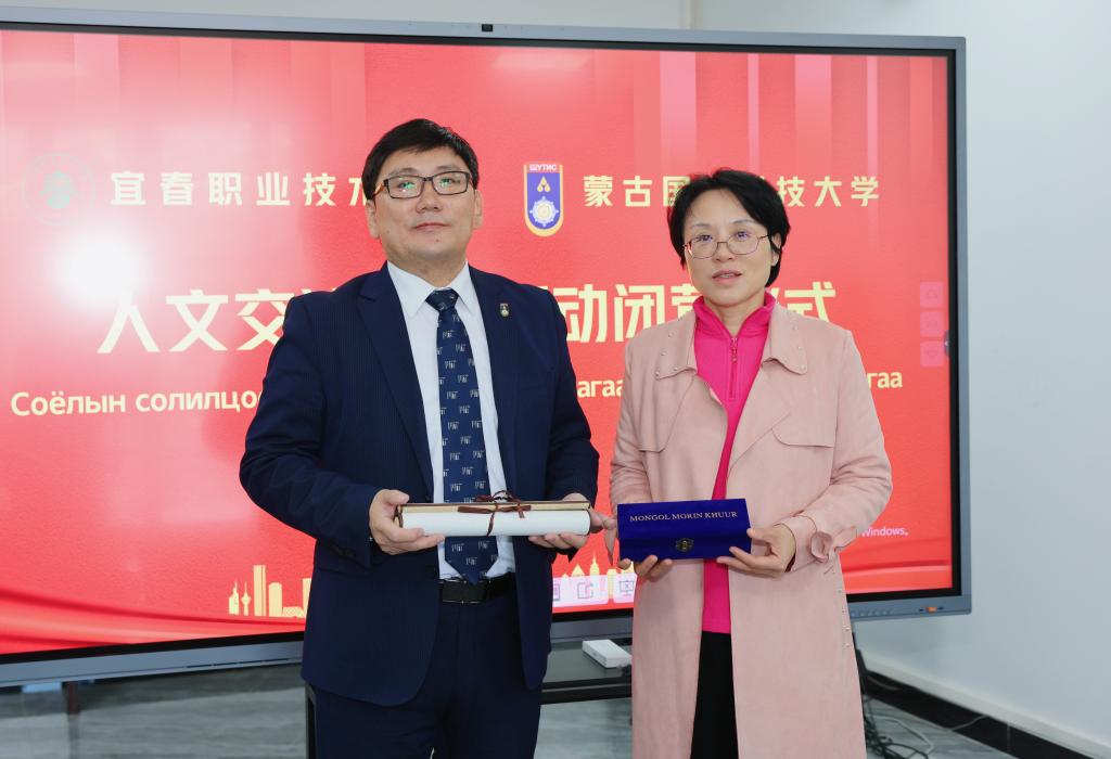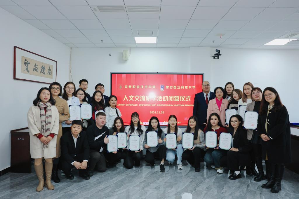 闭营仪式上,校党委委员、副校长刘江毅对每一位参与研学活动的师生们表示感谢,她希望两校以此次人文交流活动为新起点,开展更加深入的交流与合作,为两校的发展和中蒙两国友谊贡献力量。乌干巴亚尔高度评价本次研学活动,他指出,来到宜春一是深入了解了中国的职业教育,学习到了先进的教学模式,有助于推进蒙古国学校的专业发展;二是学生通过课程体验、文化交流等更加全面地感知中国,感受中国的高速发展,了解中国的传统文化和习俗,为增进中蒙友谊奠定基础。同时,他坚信两校能在未来携手共进,打造中蒙教育合作新范式。