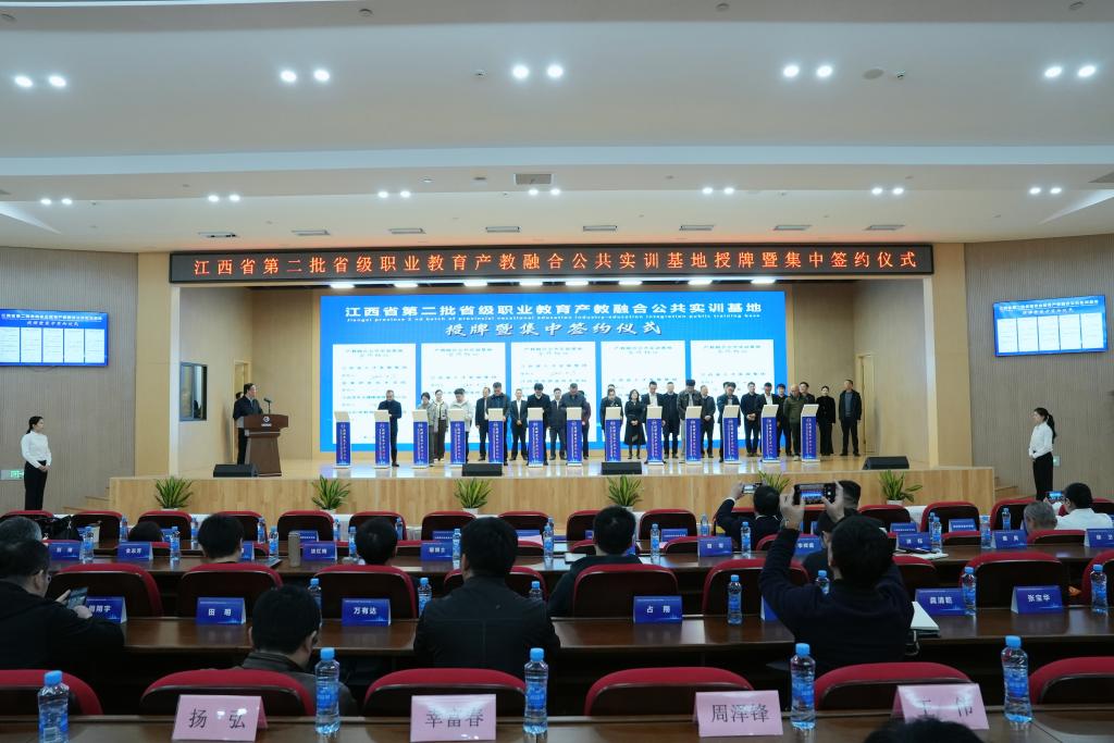 本站讯(社会合作办 彭腾)3月28日,江西省第二批省级职业教育产教融合公共实训基地授牌暨集中签约仪式在江西人才会议中心举行。本次活动由江西省教育厅、江西省国资委主办、江西省人才发展集团承办,汇聚全省职业教育与产业界精英。校党委委员、副校长刘叶建率社会合作办主任文欢、护理学院党总支书记吴少林、机电与新能源汽车学院党总支书记赵琰出席仪式,代表学校接受“锂电新能源产教融合公共实训基地”“智慧医疗产教融合公共实训基地”两项省级荣誉授牌。