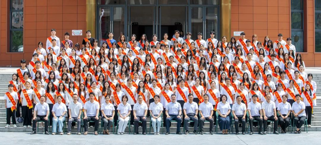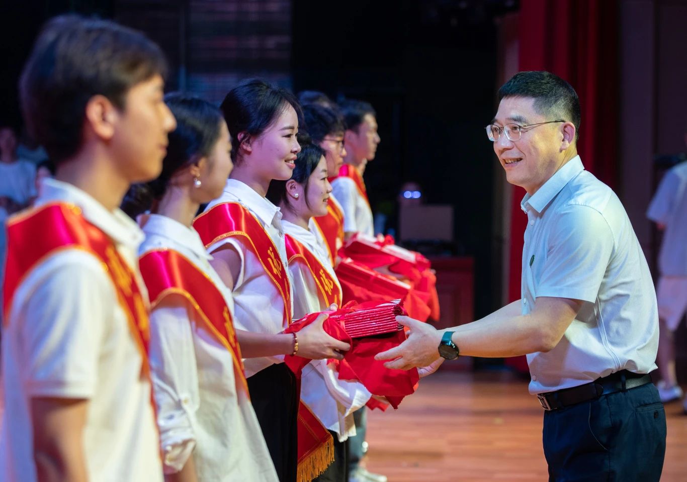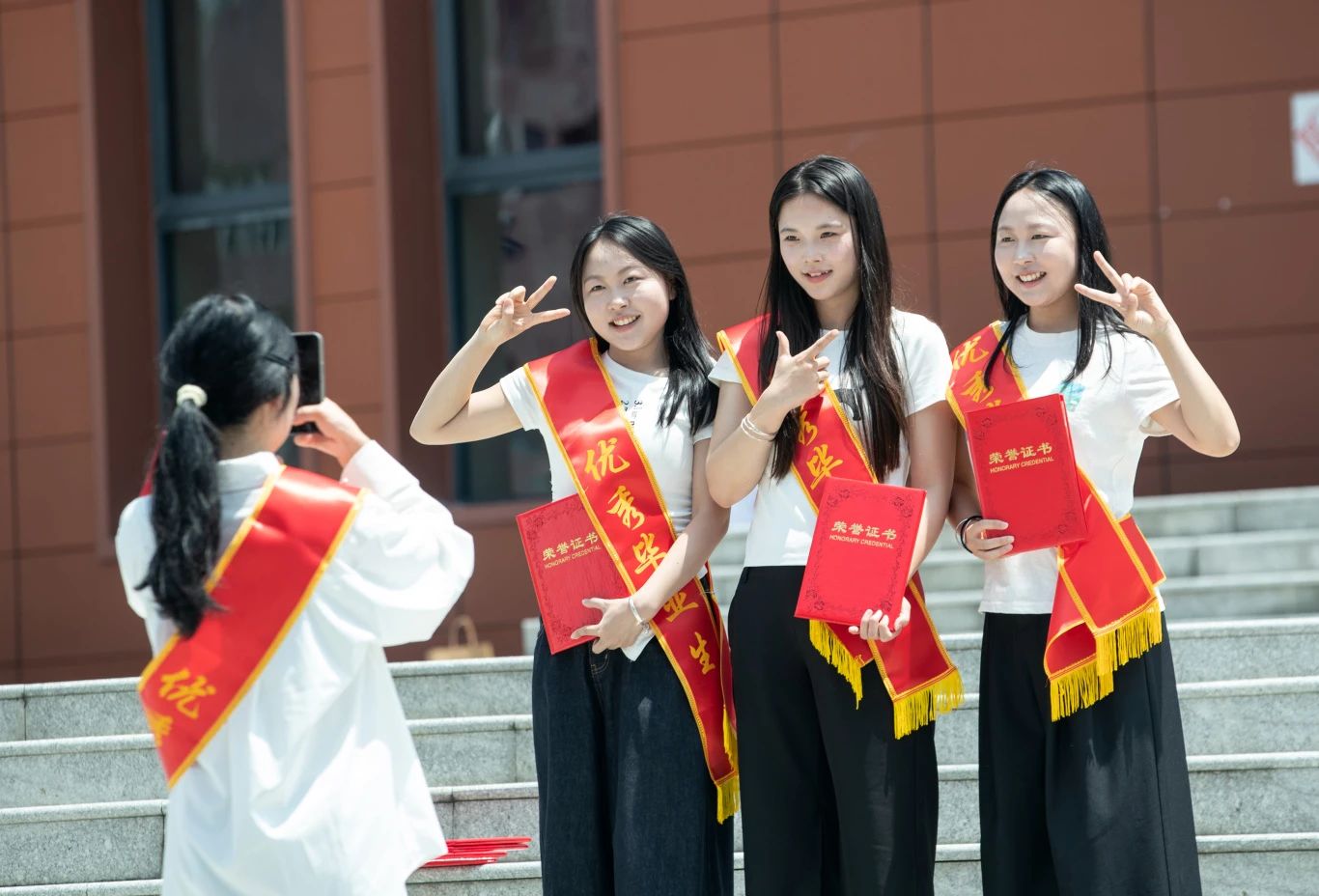 大会堂前,校领导与身披大红绶带的优秀毕业生合影留念。当骊歌响起,有人轻拭眼眶,有人互托寄语,有人相拥道别,有人将校徽别在胸前……而今,他们行囊里装着母校的叮咛,脚下正铺开崭新的征途。