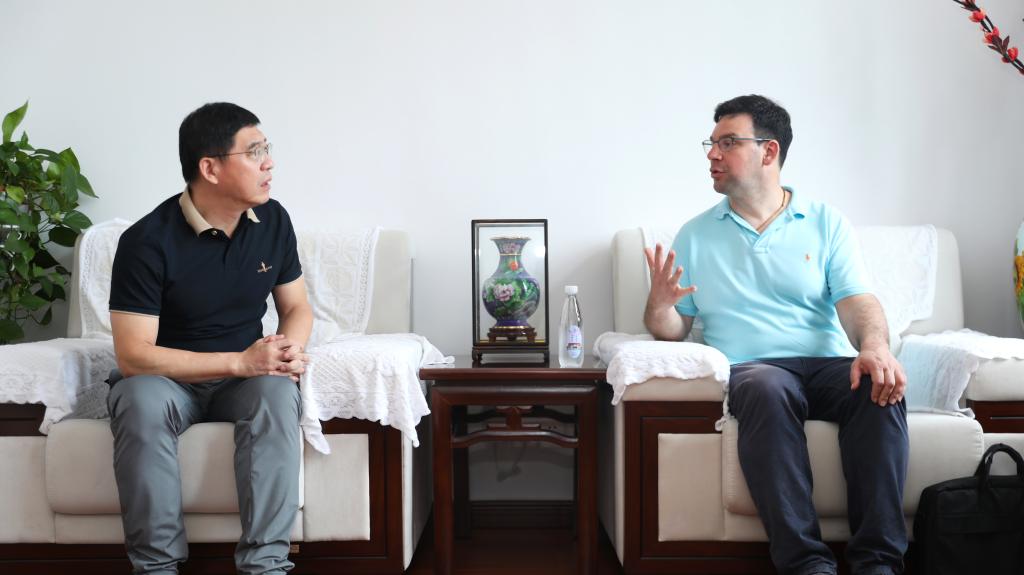 任军与Simon Appleton 一行在天工楼会客室举行座谈交流,双方围绕新西兰志愿者的教学、生活,以及英国上市公司365与新西兰之间的教育合作路径等方面进行交流。