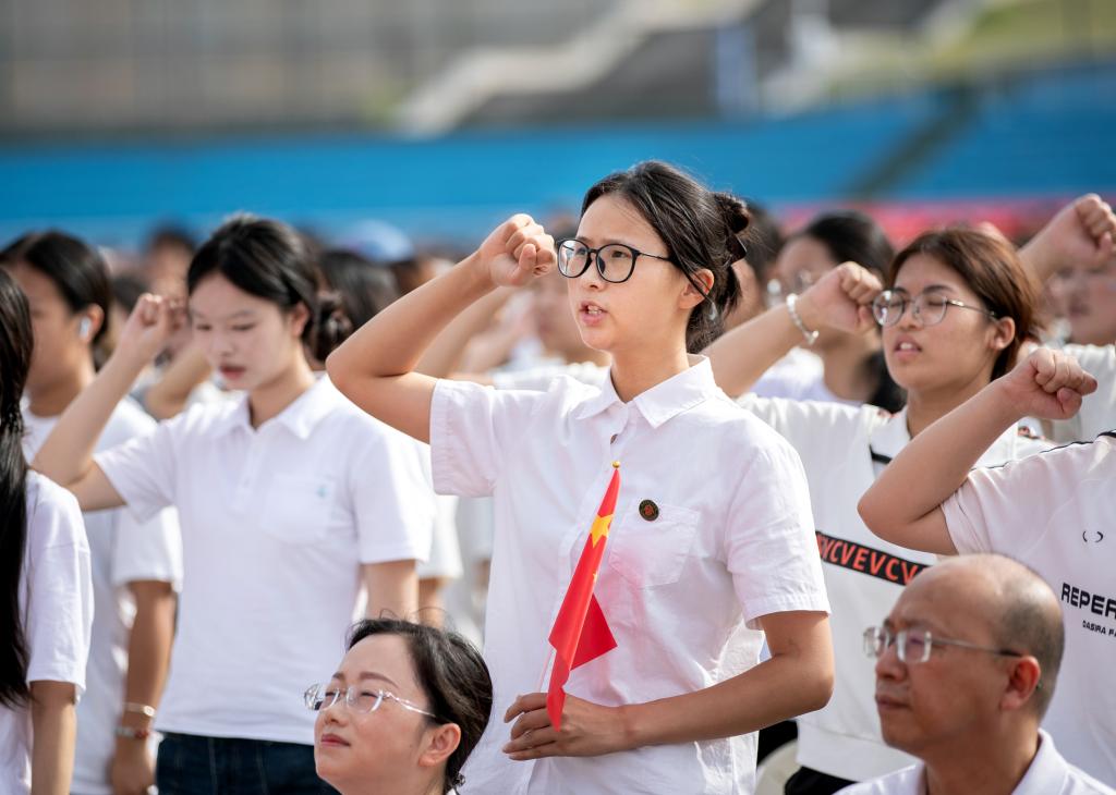 “正心修身,择善而为,品德更加高尚……”在辅导员赖培鑫的带领下,全体新生高举右拳、庄严宣誓。铮铮誓言在校园上空回荡。