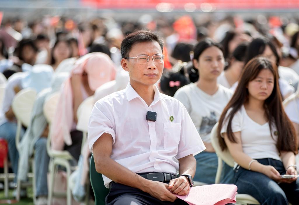 上午9时许,国旗护卫队身着戎装,步履铿锵,护送鲜艳的五星红旗至升旗台。当雄壮的《义勇军进行曲》奏响,五星红旗冉冉升起,全体师生庄严肃立,行注目礼,共唱国歌,典礼正式拉开帷幕。