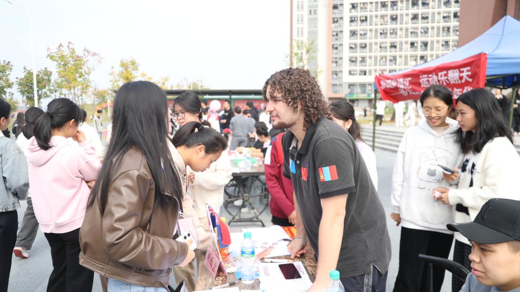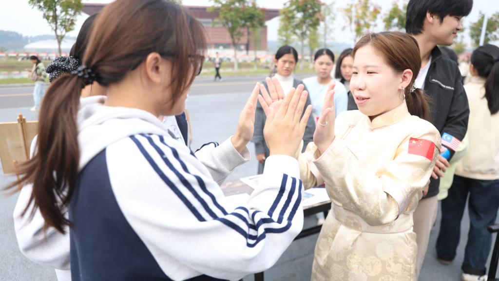 蒙古留学生高乐、乐乐、阿南、喜悦支起“蒙古文化小帐篷”:礼仪小课堂上,大家跟着学蒙古传统礼仪,举手投足间尽显草原韵味;特色游戏区笑声不断,仿佛把蒙古草原的欢乐搬到校园;知识问答连环输出冷热知识后,阿南弹奏蒙古音乐,同学们惊叹不已:“原来蒙古文化这么有料!”
