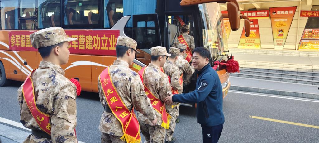 仪式结束后,新兵们与家属、班主任及辅导员合影留念,记录下这一意义非凡的人生时刻。在铿锵的锣鼓声中,新兵们胸戴大红花、精神抖擞地登上送兵车辆。校党委书记任军专程前往送行,与新兵们一一握手,亲切叮嘱大家要安心服役、苦练本领,争取早日传来立功受奖的喜讯,为国防和军队现代化建设贡献青春力量。