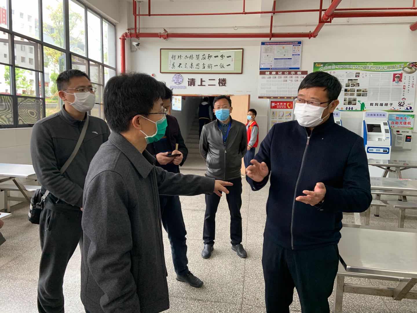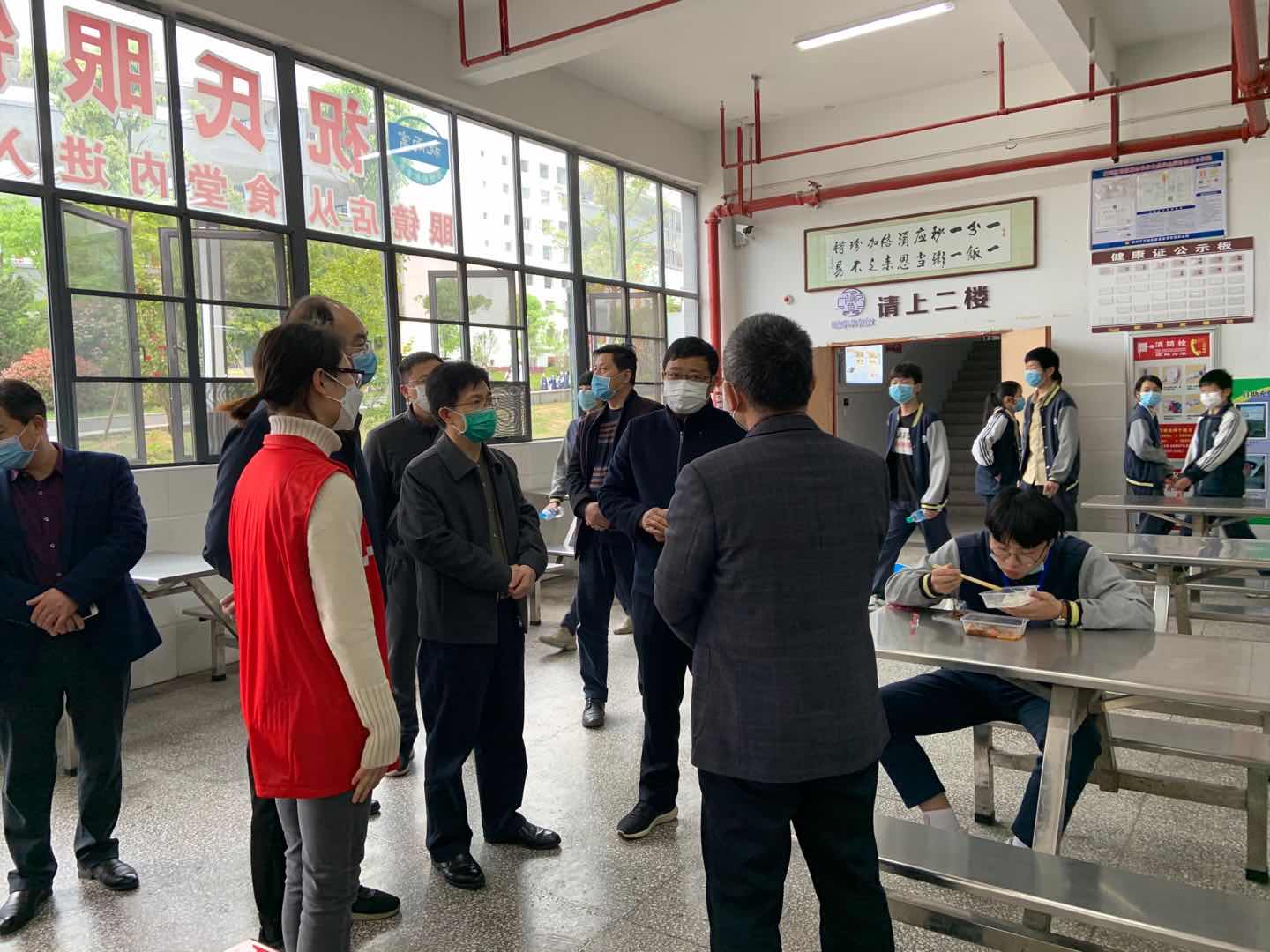 杨校长一行首先在学校大门外体验了红外线体温检测仪,对高科技带来的便捷、高效赞叹不已。随后,在九中党总支书记、校长黄旭波的带领下,先后到学校防疫物资储备处、隔离室、医务室、食堂等地,每到一处,黄书记都详细介绍准备及目前运行状况,还重点介绍了学校防控机制、应急处理办法以及开学一周以来的取得的先进经验。