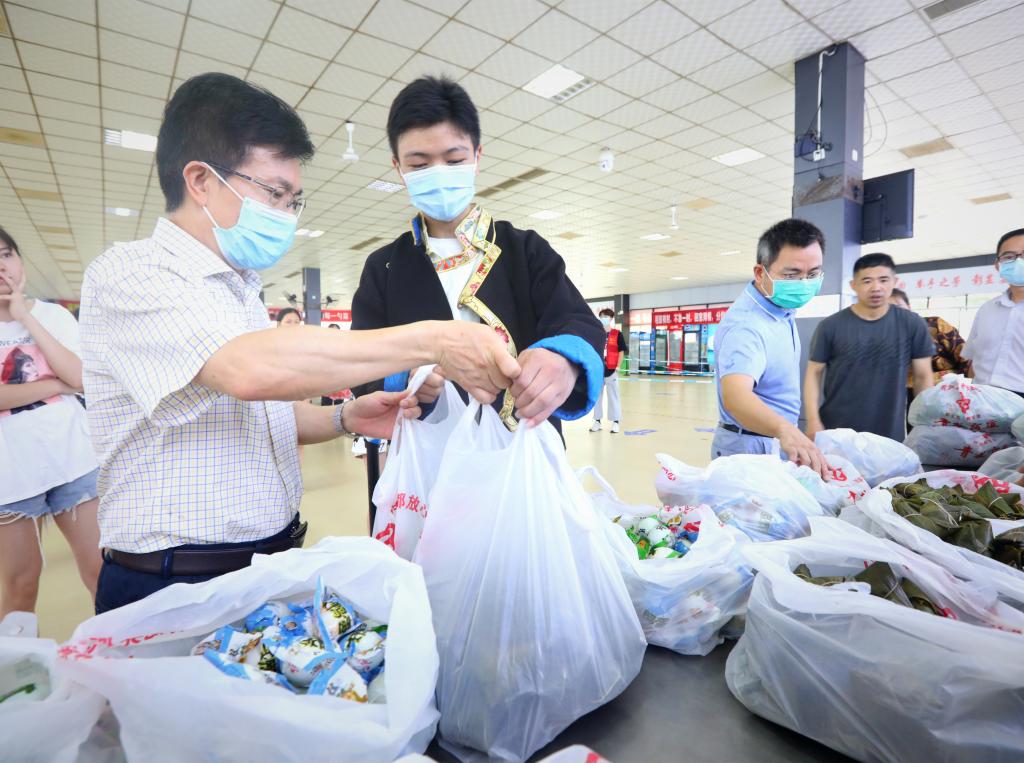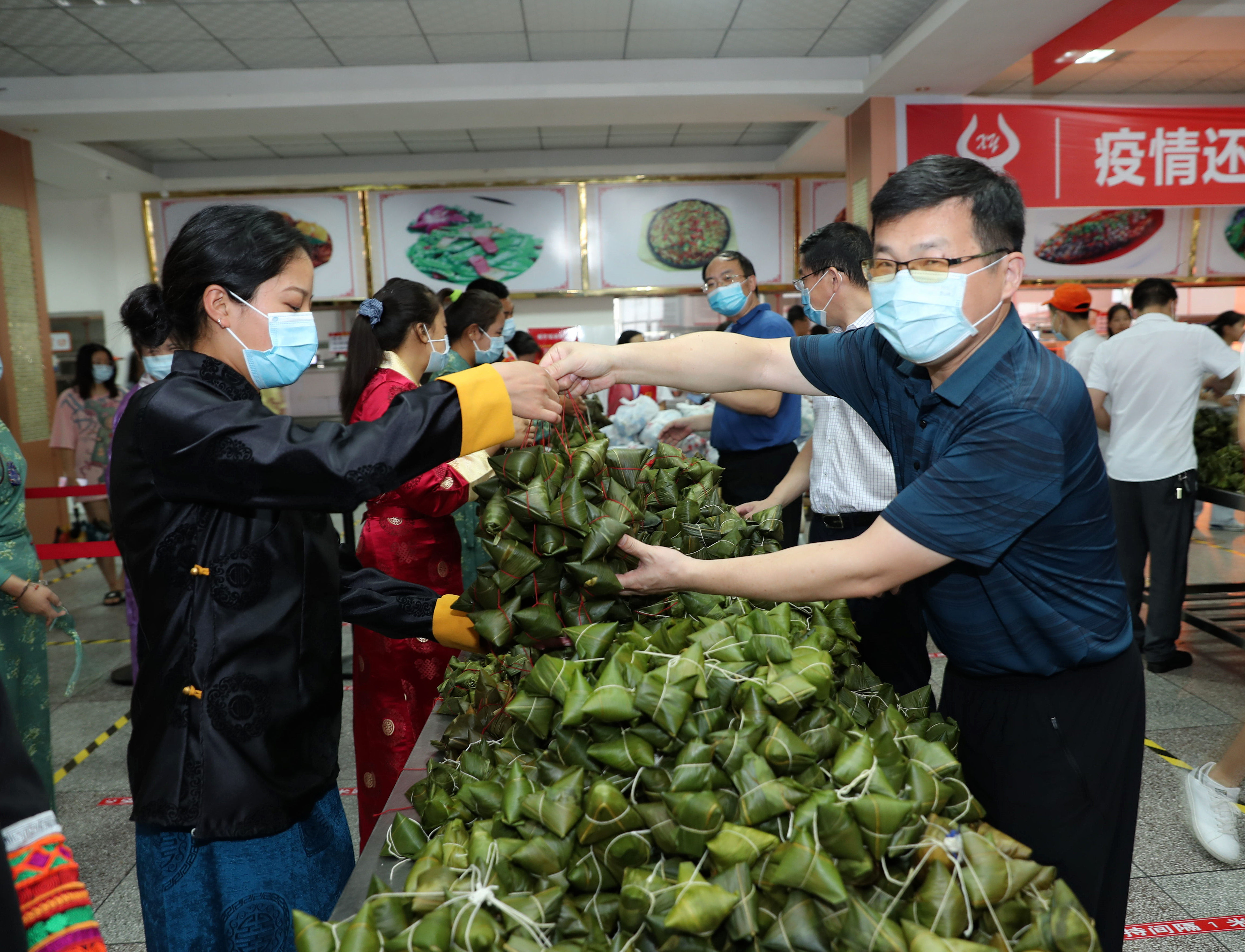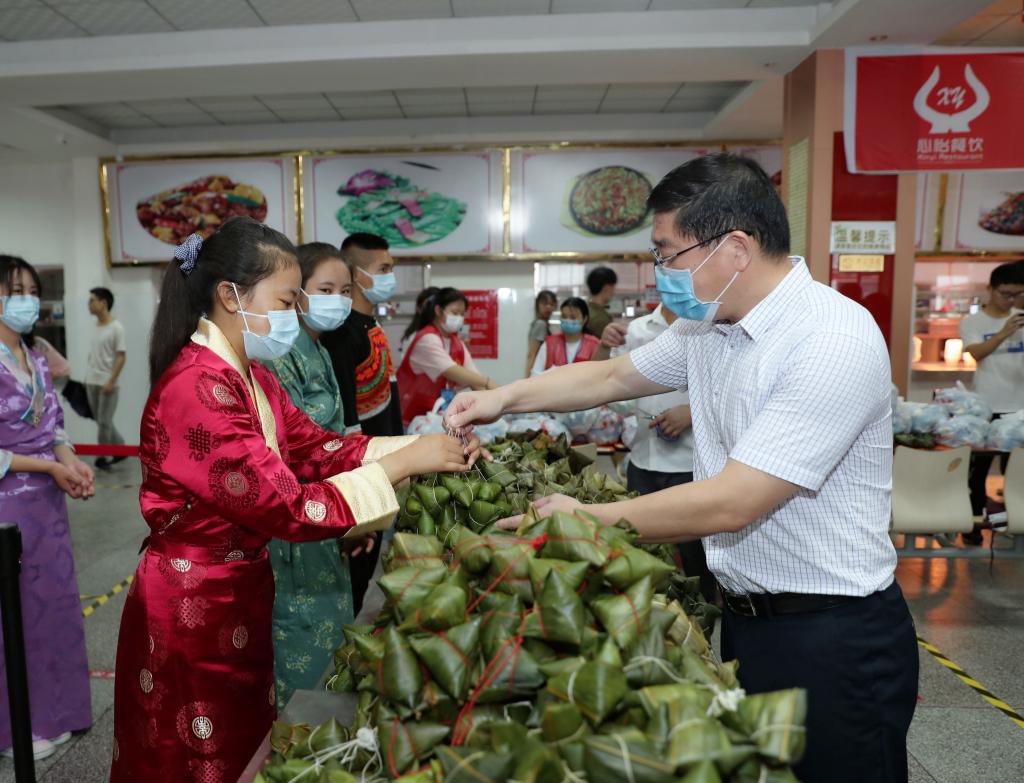 上午9点,校党委书记任军,校长杨云山,党委副书记高健群,副校长刘军、张印华等校领导纷纷来到现场,为同学们送上节日的祝福。现场气氛热烈、其乐融融,同学们笑容满面地领取粽子和咸蛋,急切地想把学校的心意带回寝室和大家分享。