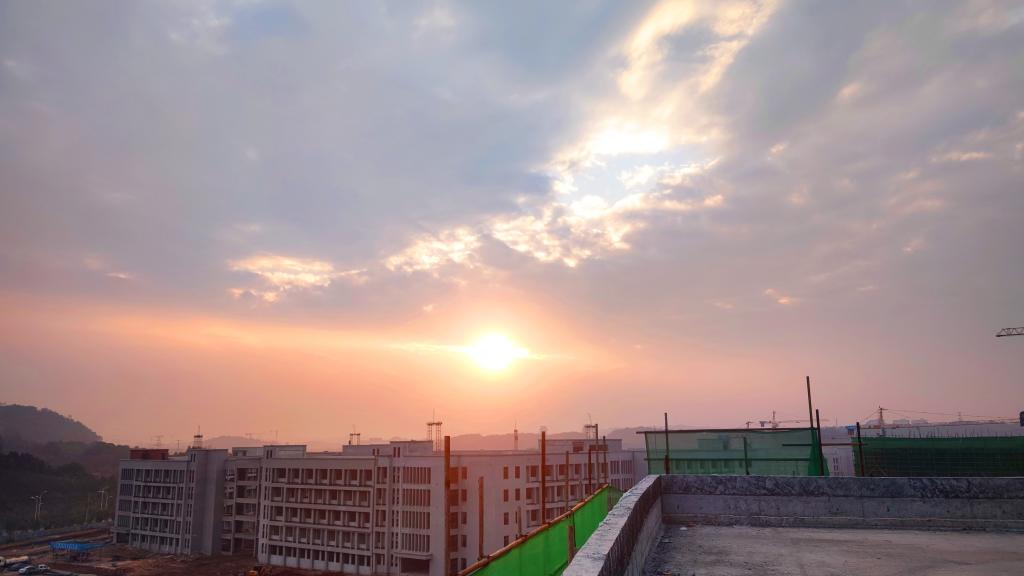 登临图书楼楼顶,放眼新校区全貌,金色的夕阳下,密密麻麻的脚手架高耸在上千亩的热土上。工程车来来往往,塔吊一刻不停,工人们有的运送材料,有的拆除外架,有的砌墙粉刷……热火朝天的施工场景让人备受鼓舞。