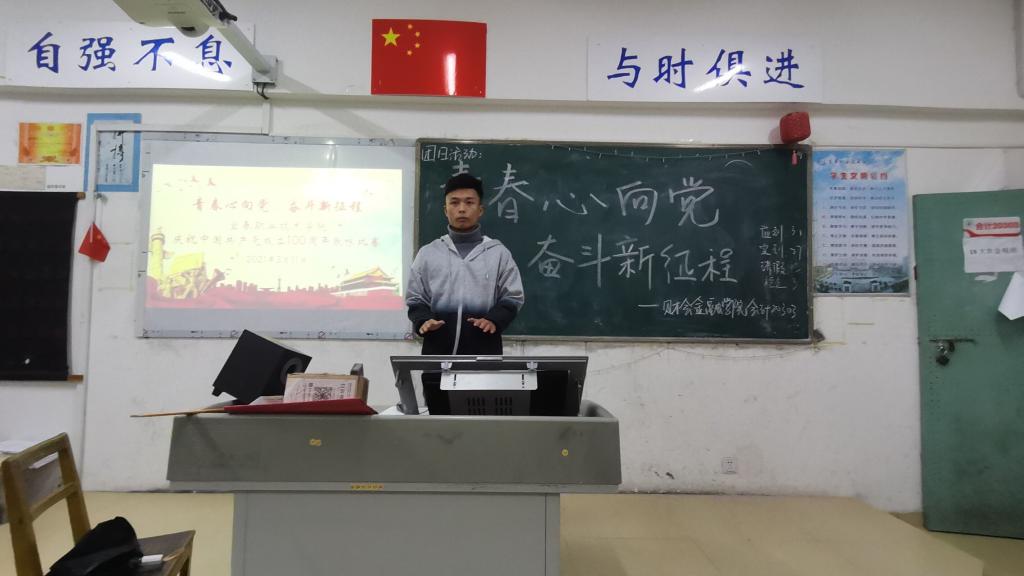 本站讯(财会金融学院 潘骁哲 学生记者 伍婷婷 吴静)为弘扬红色革命精神,展现当代大学生风采。3月11日晚,财会金融学院于第一教学楼开展“青春心向党,奋斗新征程”主题团日活动,所有班级积极响应,向建党100周年献礼。