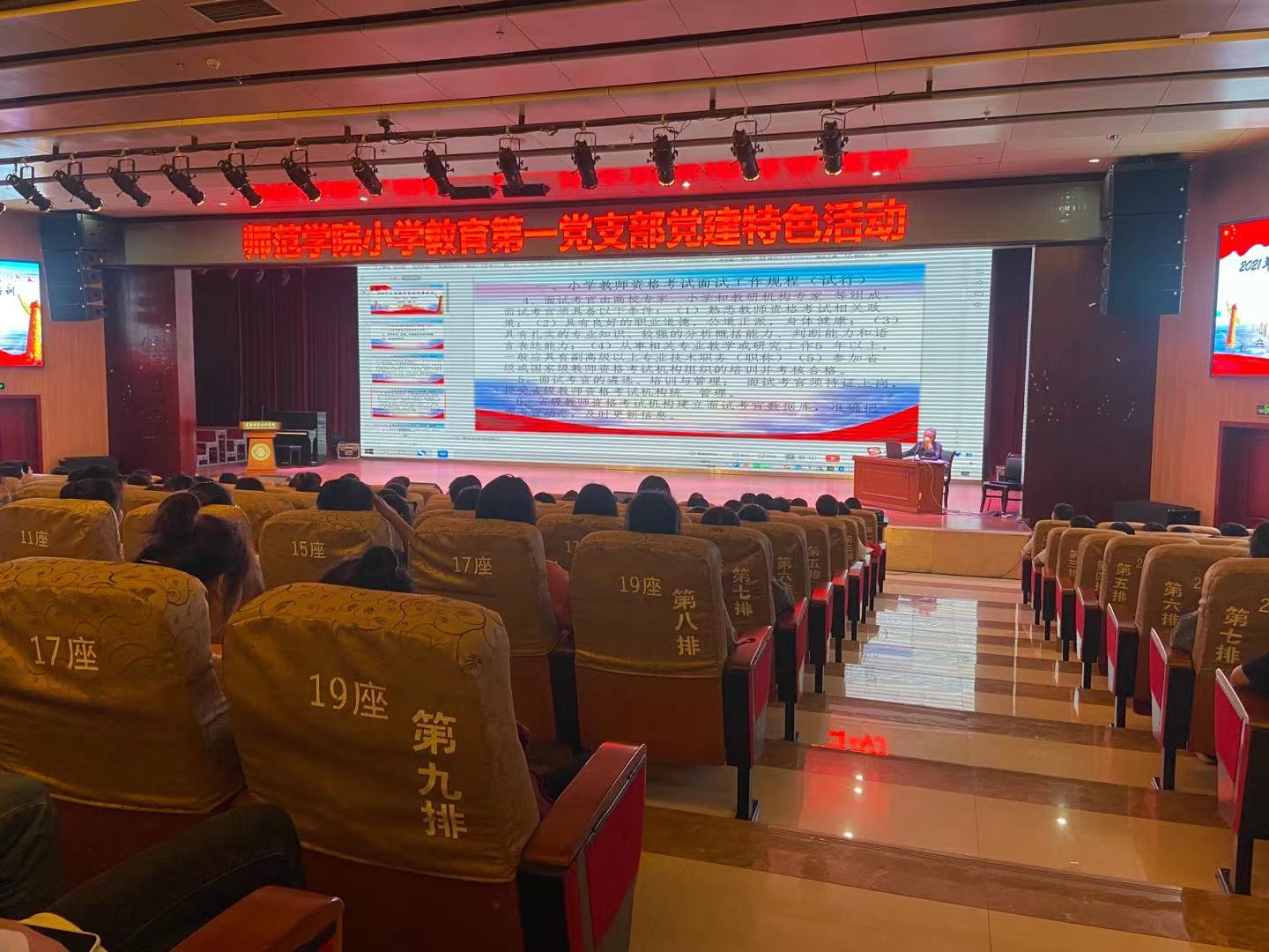本站讯(师范学院党总支 张婧莉)2021年4月21日晚7点,师范学院党总支党建特色活动——教师资格证面试考前培训会在科技综合楼二楼学术报告厅举行,本次培训会由师范学院小学教育第一党支部书记李彪主讲,现场500多名学生接受了此次培训。