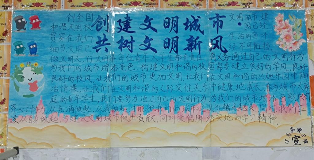 开展室内板报设计评比活动,是我院助力我市“创文”系列活动的一个重要组成部分。让我们共同努力,用实际行动创建文明城市,创建更加美好的幸福生活。