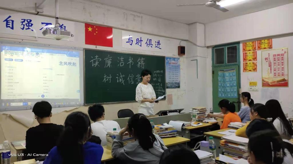 班会上,各班班主任带领学生共读《习近平关于全面从严治党论述摘编》一书中“以零容忍态度惩治腐败”选节内容,结合党史中清正廉洁的人物事迹,引导学生结合自身实际谈感想、谈体会,号召大家继承和发扬中华民族的传统美德,养成廉洁自律的生活作风,进一步坚定理想信念,杜绝奢侈浪费,在生活和学习中注重诚实守信,为接下来的学习和考试做好准备。