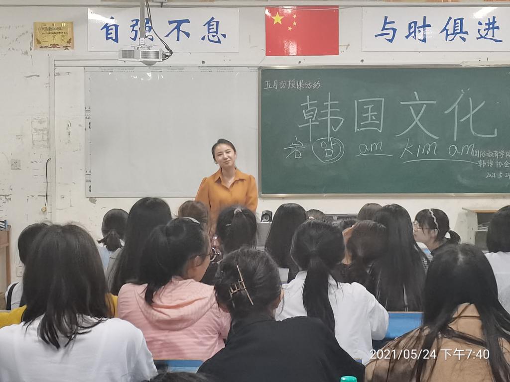 本站讯(国际教育学院 学生记者 邓韵婷)为扩宽同学们的国际视野,丰富同学们的课余生活,国际教育学院韩语协会于5月24日19点在第一教学楼开展韩语协会授课活动。此次活动主题为"韩国文化",主讲老师为指导老师金岩,共有37名学生参加了活动。
