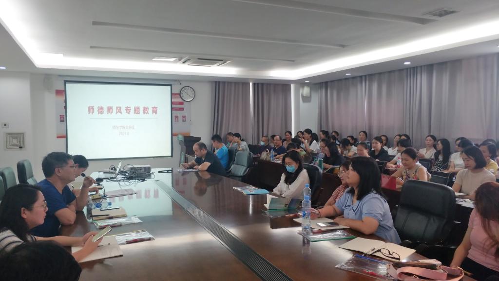 本站讯(师范学院党总支 任玉慧)百年大计,教育为本。教师是立教之本、兴教之源,承担着让每个孩子健康成长、办好人民满意教育的重任。师范学院党总支于8月24日上午10点组织全体教师开展了师德师风专题教育活动,因疫情防控需要,本次活动分为两个会场,分别由师范学院院长雷水龙同志及党总支书记邹晓英同志主持。