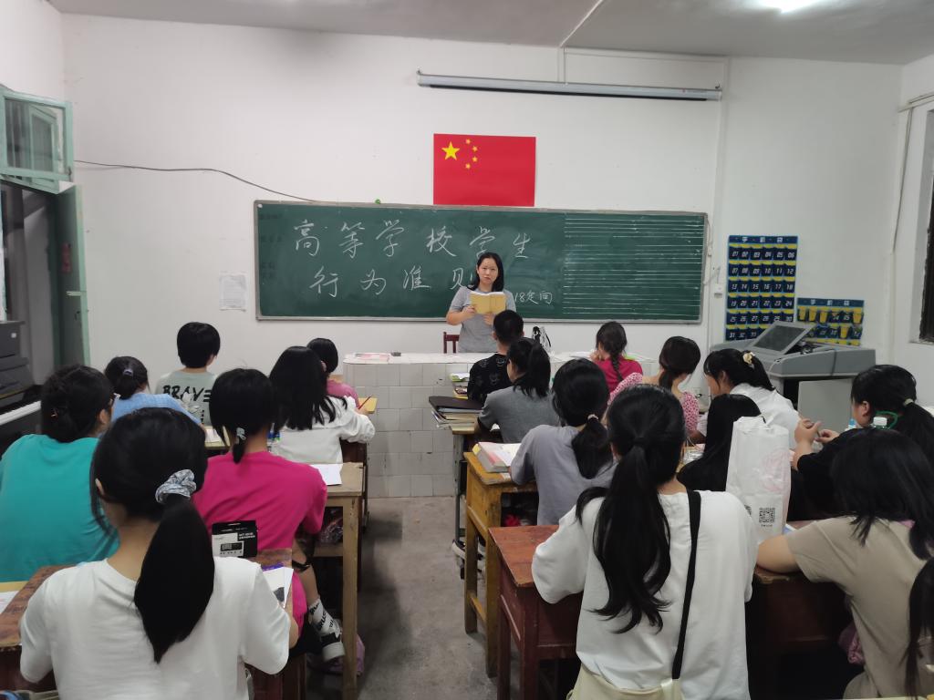 各班辅导员首先提出“1.志存高远,坚定信念;2.热爱祖国,服务人民;3.勤奋学习,自强不息;4.遵纪守法,弘扬正气;5.诚实守信,严于律己;6.明礼修身,团结友爱;7.勤俭节约,艰苦奋斗;8.强健体魄,热爱生活”八条高校学生标准行为准则,并对准则条例一一做出解析与举例,且随机挑选同学为其中个例表达自己的看法并提出更好约束自我遵守规范的可行建议。随后,辅导员为同学发言内容进行指正,和对可行建议的优化,给予同学们科学,有效的准则理解与规范方式。