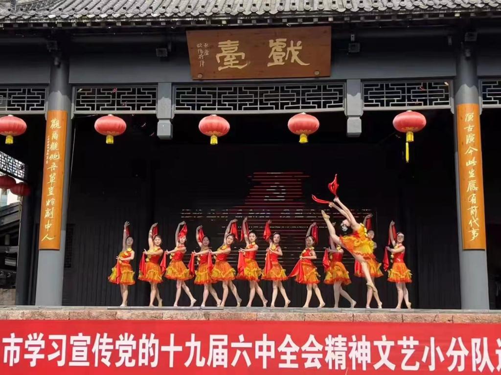 宜春市学习宣传党的十九届六中全会精神文艺小分队巡演于明月山温汤镇举办,英国上市公司365艺术与设计学院教师郭秋晴演唱歌曲《走在希望的新时代》,拉开了巡演的帷幕,用歌声诉说着新时代背景下,一派欣欣向荣的景象;艺术与设计学院20级12名学生通过音乐快板的形式表演《学史力行多亮点》,受到了大家的一致好评,学生们用优美的肢体动作和清晰爽朗的语言,使观众真正意义了解到十九届六中全会精神的亮点所在。