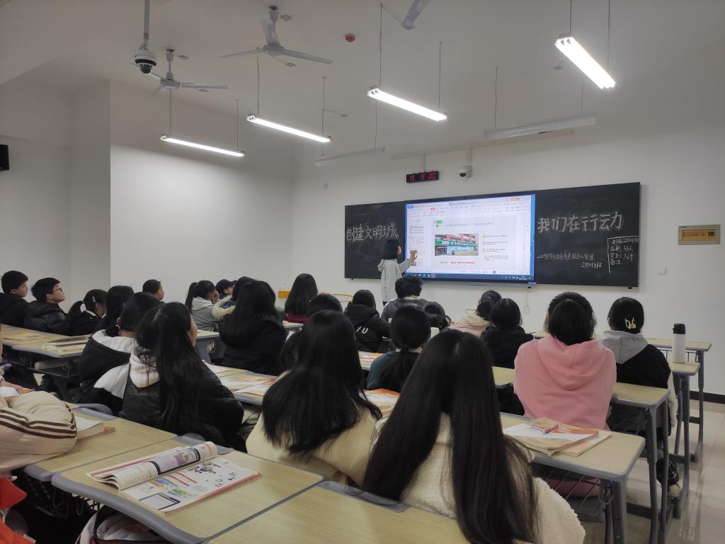 班会前,同学们精心组织,认真做好班会准备。会上,同学们通过图片、视频、歌谣等形式再次温习了社会主义核心价值观、创文明城市、创文明校园、创文明班级等方面的知识。随后,团支书带领同学们就创建文明城市我们能做什么、如何提升文明素质等问题展开了讨论,积极为创文明城市工作建言献策。同学们纷纷表示要从身边小事做起,自觉养成良好的行为习惯,做一名文明的大学生,积极投入到创建文明城市的工作中去,创文明班级、创文明校园、创文明城市。