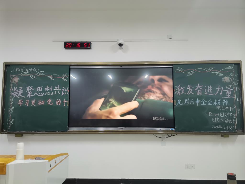 本站讯(师范学院 霍文杰 学生记者 陶敏)为深入贯彻学习党的十九届六中全会精神和习近平总书记的青年工作思想,切实推进团员青年思想政治教育,大力弘扬伟大建党精神,师范学院于2021年12月28日晚在南校区和新校区正心楼各班开展以“凝聚思想共识•激发奋进力量——学习贯彻党的十九届六中全会精神”为主题的团日活动。本次活动由师范学院工作人员进行观摩和指导。